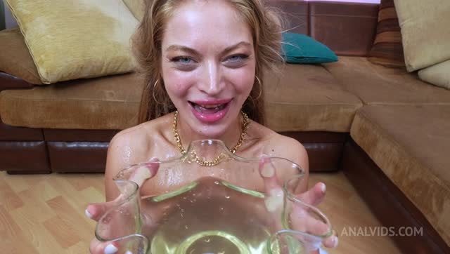 First Piss! 5on1 first time slut Dina Joy gets a portion of piss along with a double vagina from five big cocks